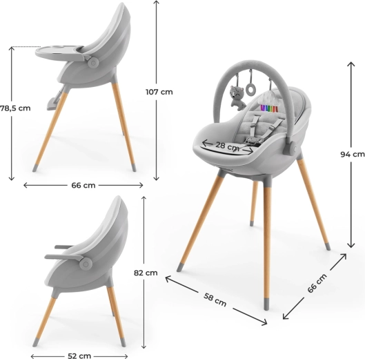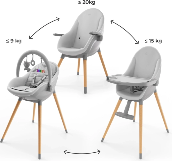 - 3în1 de la naștere până la 20 kg – șezlong, scaun de masă, scaun joasă pentru copil mai mare.