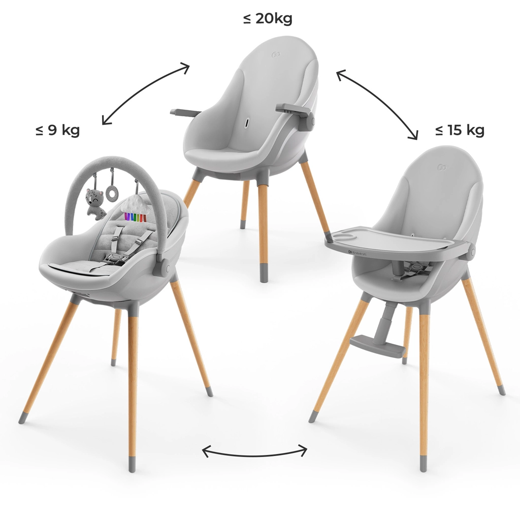 Kinderkraft FINI UP aduce o soluție inteligentă pentru viața de zi cu zi alături de bebe. Într-un singur design combină un șezlong confortabil pentru primele luni, un scaun de masă sigur pentru diversificare și un scaun joasă stilat pentru statul independent la masă. Datorită reglajului rapid fără unelte, comuți ușor între moduri și adaptezi înălțimea șezutului și tăvița nevoilor actuale ale copilului.