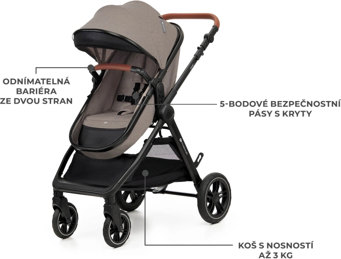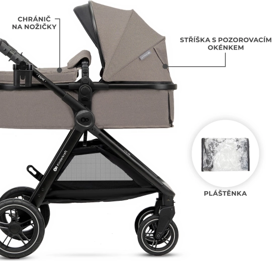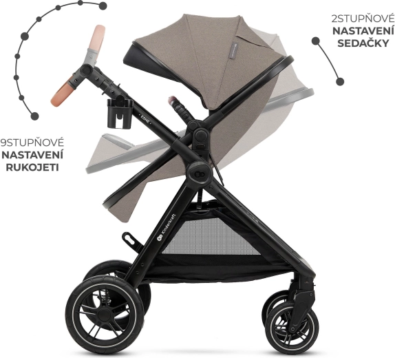 Confort pe orice suprafață – roțile mari din TPE, cu suspensie, care nu se pot înțepa sunt ușoare, manevrabile și potrivite atât pentru oraș, cât și pentru teren variat. Căruciorul este ușor de condus, roțile din față pot fi blocate pentru mers drept, iar întregul șasiu se pliază compact chiar și cu scaunul – ideal în călătorii.