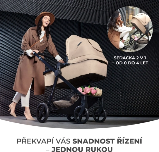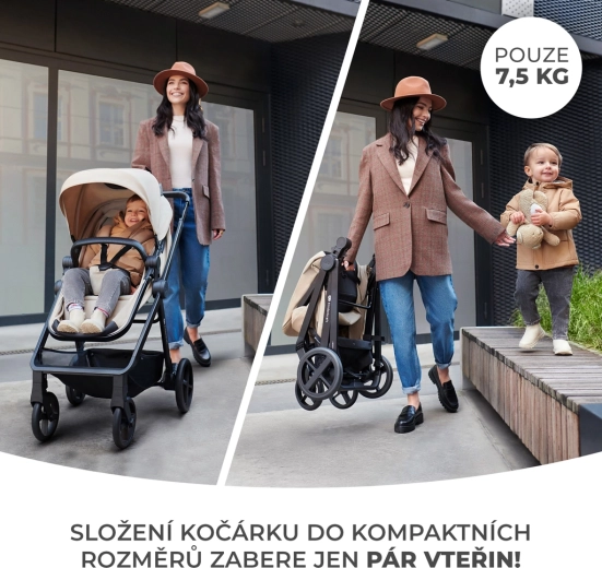 O singură unitate pentru ambele etape – landoul se transformă în câteva clipe într-un șezut sportuos spațios, orientat atât spre față, cât și spre părinte. Căruciorul cântărește doar 7,5 kg, fiind ușor de manevrat și transportat.