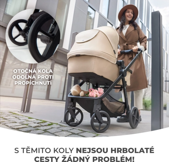 Roțile mari, cu suspensie, care nu necesită umflare, fac față trotuarelor din oraș și aleilor din parc. Capotina impermeabilă cu UPF50+, cu panou de ventilație și fereastră, protejează copilul de soare, vânt și ploaie. Căruciorul se pliază cu tot cu șezut într-un format compact, economisind spațiu în apartamentele mici. În pachet găsiți numeroase accesorii: husa pentru picioare, pelerină de ploaie, adaptori și scaun auto MINK PRO i-Size pentru trecerea lină de la mașină la cadrul căruciorului.