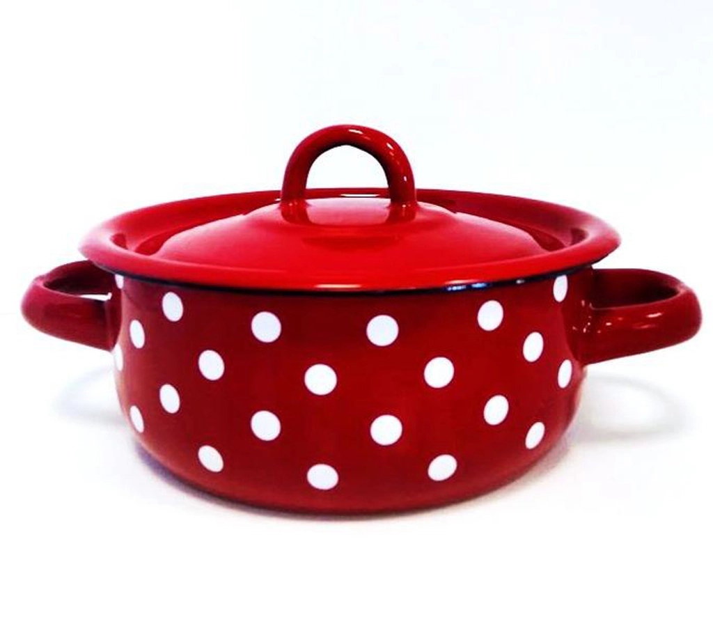 Oală emailată stilată cu capac, volum 1,5 l, în decorul iconic buline roșii, ideală pentru gătitul zilnic. Este potrivită pentru toate tipurile de plite, inclusiv inducție și, datorită celor două mânere solide, se transportă ușor. Suprafața emailată rezistentă asigură durabilitate îndelungată și întreținere simplă.