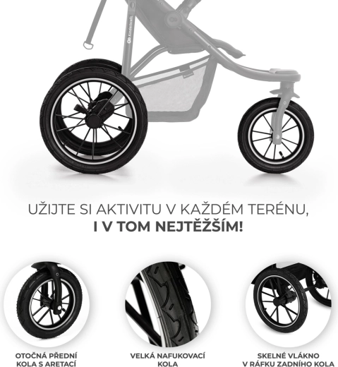Roțile mari, umplute cu aer, împreună cu suspensia atenuează lin denivelările și asigură stabilitate și confort atât pe teren accidentat, cât și în oraș. Roata din față poate fi blocată pentru mers drept.