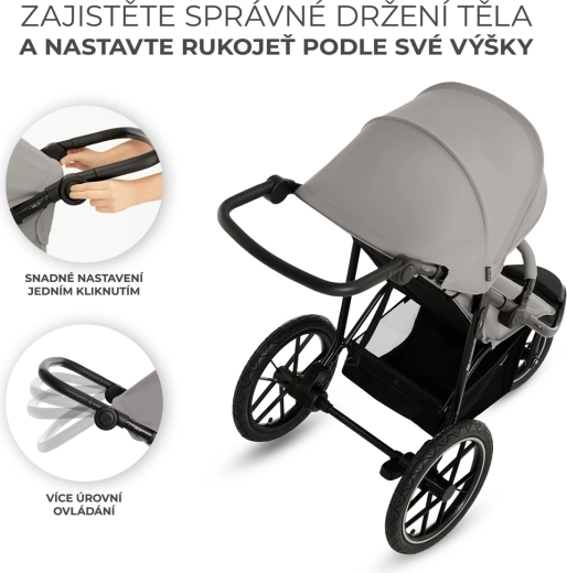 Spătar reglabil până la poziția culcat, suport mare pentru picioare și mâner reglabil pe înălțime oferă confort maxim. Capotina cu fereastră facilitează contactul cu copilul.