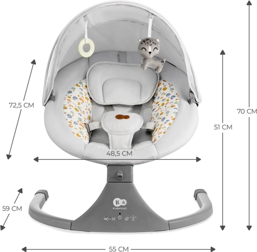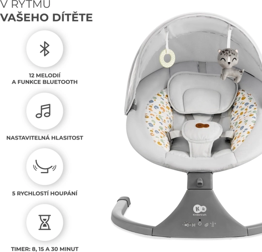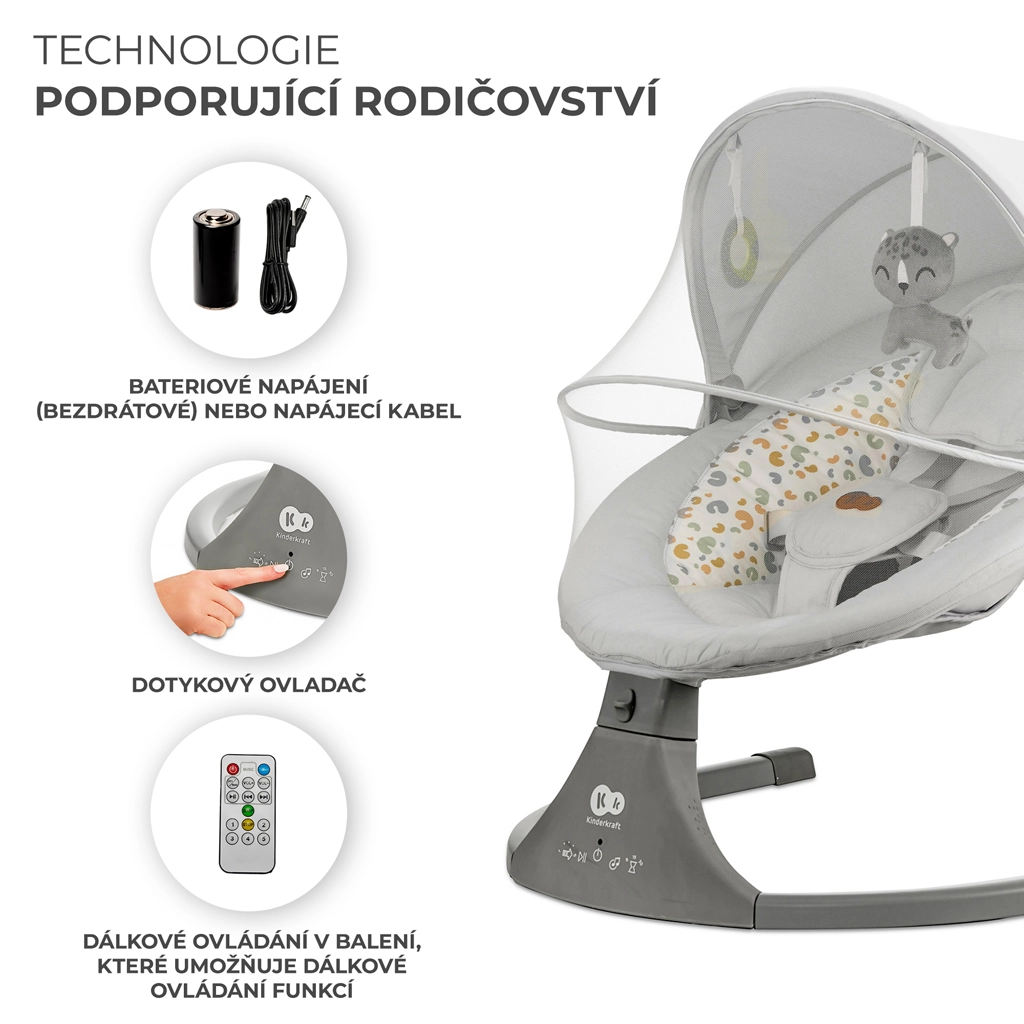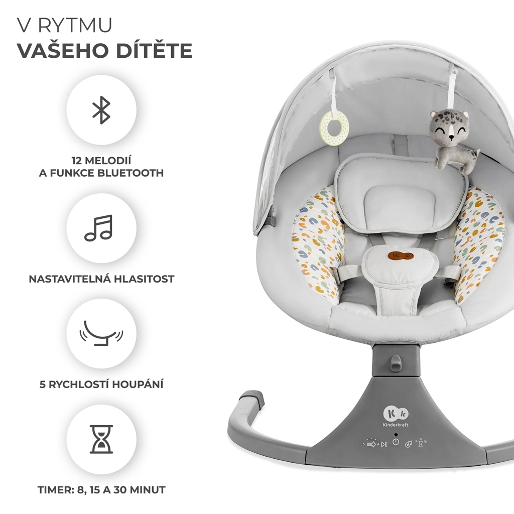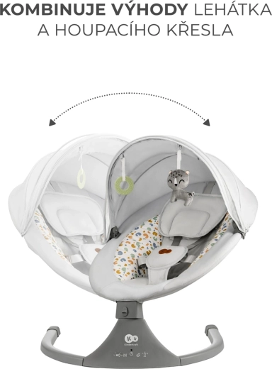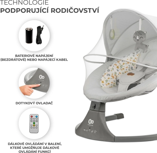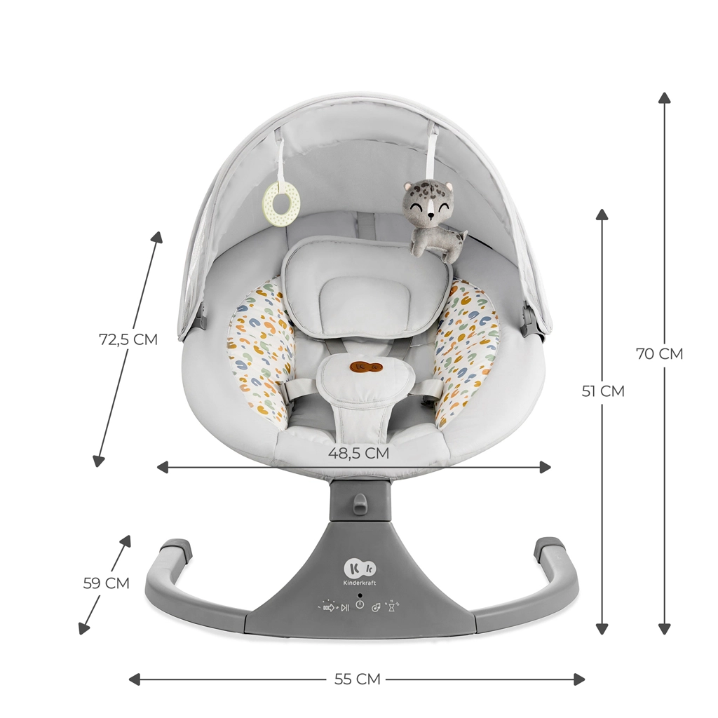 Balansoarul Kinderkraft LUMI îmbină tehnologia modernă cu un design sigur pentru adormire confortabilă de la naștere până la 9 kg. Datorită legănării laterale, bebelușul se simte ca în brațe, în timp ce motorul silențios nu perturbă somnul. Cu conectivitate Bluetooth și intrare USB, redați cu ușurință cântecele de leagăn preferate direct de pe telefon.