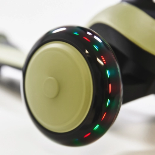 Roțile frontale mari din PU cu LED se aprind în timpul mersului. Măresc vizibilitatea pe înserat și oferă un aspect spectaculos fără baterii.