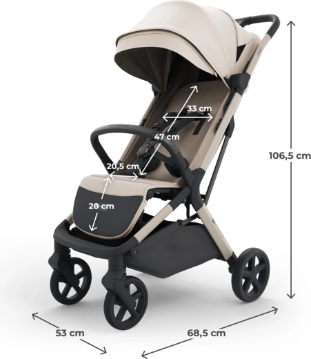 Confortul copilului este asigurat de spătarul și suportul pentru picioare reglabile de la șezut până la poziție culcat, copertina impermeabilă cu UPF50+ și ventilația împotriva supraîncălzirii. Părinții vor aprecia catarama magnetică pentru prinderea rapidă a centurilor, suportul pentru picioare ușor de curățat (easyclean), coșul mare accesibil din ambele părți (până la 5 kg) și accesoriile practice incluse – suport pentru băuturi și plasă anti-insecte.