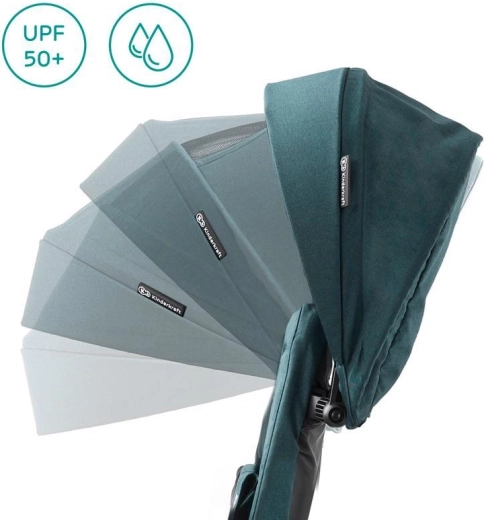 Cadrul din aliaj de magneziu este excepțional de ușor și robust, roțile din spate cu rulmenți și anvelopele PU fac față atât trotuarelor urbane, cât și aleilor din parc. Copertina impermeabilă cu UPF 50+ protejează împotriva soarelui și a ploii, iar părinții vor aprecia mânerul telescopic cu control prin buton pentru ghidaj precis și frâna de parcare pe roțile din spate. Datorită funcției de roată liberă, copiii învață în siguranță să pedaleze fără a mișca pedalele.