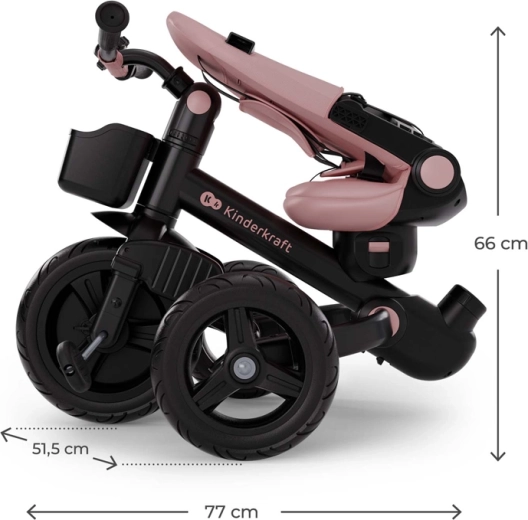 Părinții vor aprecia mânerul reglabil pe 3 înălțimi, funcția de roată liberă pentru primele pedalări în siguranță și plierea rapidă și intuitivă pentru depozitare ușoară în portbagaj sau dulap. Siguranța este asigurată de centurile în 5 puncte și de bara de protecție, iar accesoriile practice – geantă, clopoțel, suport pentru pahar și două coșulețe – oferă loc pentru jucării și esențiale.