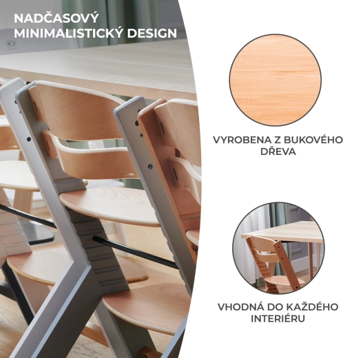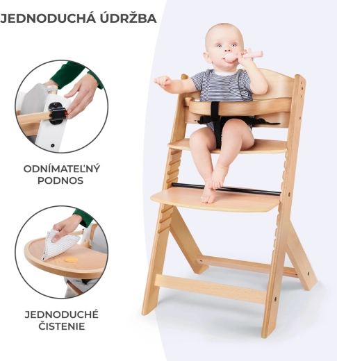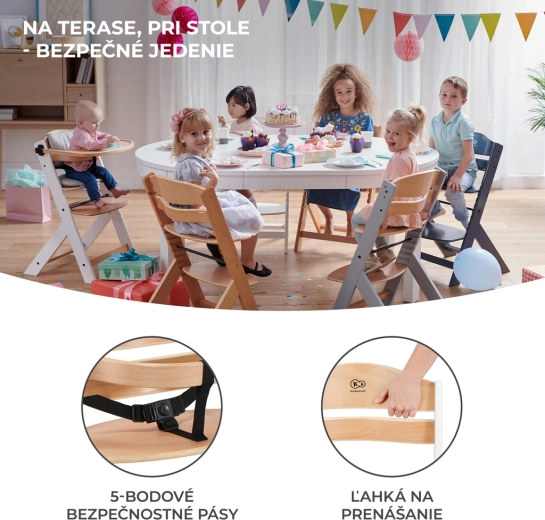 Pentru cei mai mici este disponibil un blat larg detașabil și centuri în 3 puncte, iar pentru copiii mai mari balustradă de siguranță. Scaunul se curăță ușor, iar construcția sa ușoară permite mutarea comodă între bucătărie, sufragerie și terasă. Designul minimalist se potrivește perfect în interioare scandinave, clasice și moderne.