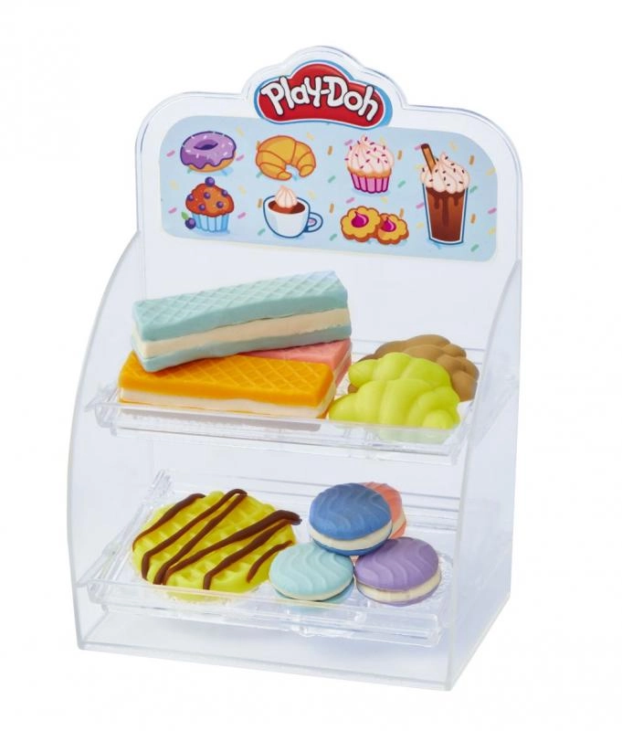 - Aparat pentru băuturi cu pârghie, stație pentru „frișcă”, matrițe pentru biscuiți/brioșe/gogoși, pahare și ustensile, vitrină transparentă, 8 borcănașe cu plastilină Play-Doh, în total 20 de accesorii