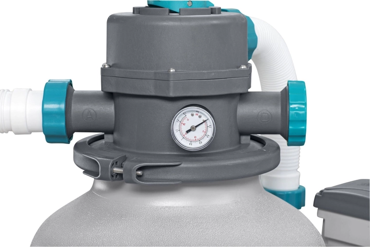 Valva cu 6 poziții permite comutarea rapidă a funcțiilor (filtrare, spălare inversă, clătire, închidere și altele), în timp ce temporizatorul integrat automatizează funcționarea în intervale prestabilite. Instalarea este simplă, iar furtunurile compatibile vă permit să conectați cu ușurință sistemul la piscina dvs. și să începeți imediat filtrarea.