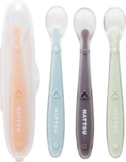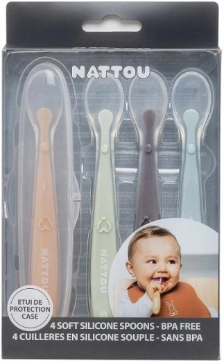 Set practic de patru lingurițe pentru copii NATTOU pentru hrănirea confortabilă a bebelușilor și a copiilor mici. Datorită vârfului din silicon extra moale și flexibil, sunt blânde cu gingiile sensibile, mânerele ergonomice ușurează priza, iar siliconul durabil 100% fără BPA asigură utilizarea în siguranță acasă și în călătorii.