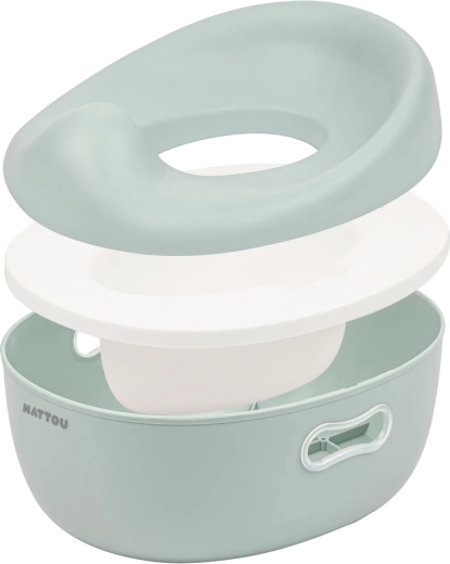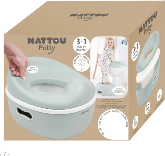 Olița NATTOU Potty 3în1 este o soluție inteligentă pentru fiecare etapă a învățării folosirii toaletei. Începe ca o oliță compactă, cu șezut confortabil și parte frontală înălțată împotriva stropirii. Când copilul este pregătit, poți trece ușor la reductorul pentru WC-ul obișnuit și la scăunel, care oferă înălțimea și stabilitatea necesare.