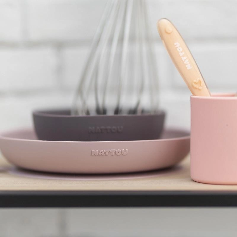 Practic, setul de masă din 4 piese din silicon moale de la Nattou ușurează primele piureuri și alimentația independentă. Conține un farfurioară și un bol cu ventuză anti-alunecare, un pahar și o linguriță moale, blândă cu gingiile. Datorită marginilor interioare rotunjite, mâncarea se ia ușor; siliconul este rezistent, indestructibil și fără BPA, potrivit pentru mașina de spălat vase și pentru utilizare zilnică.