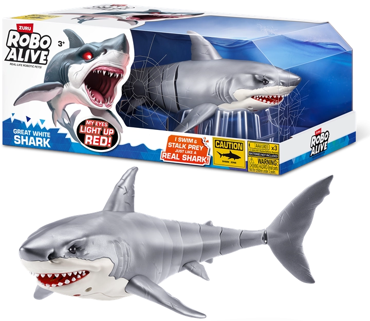 Marele rechin alb ROBO ALIVE de la ZURU transformă fiecare baie într-o aventură plină de acțiune. După scufundare, se activează singur și înoată ca un adevărat prădător marin. Copiii vor fi încântați de combinația dintre mișcările fluide și realiste și ochii luminoși, care intensifică senzația de vânătoare sub apă.