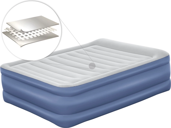 Materialul durabil TRITECH (PVC + straturi ranforsate) minimizează pierderea de presiune și prelungește durata de viață. Pompa electrică integrată de 220–240 V umflă și dezumflă salteaua rapid și fără efort; la nevoie se poate folosi și o pompă manuală sau de picior clasică. Pachetul include geantă de transport pentru manevrare ușoară și petic de reparare pentru intervenții rapide.