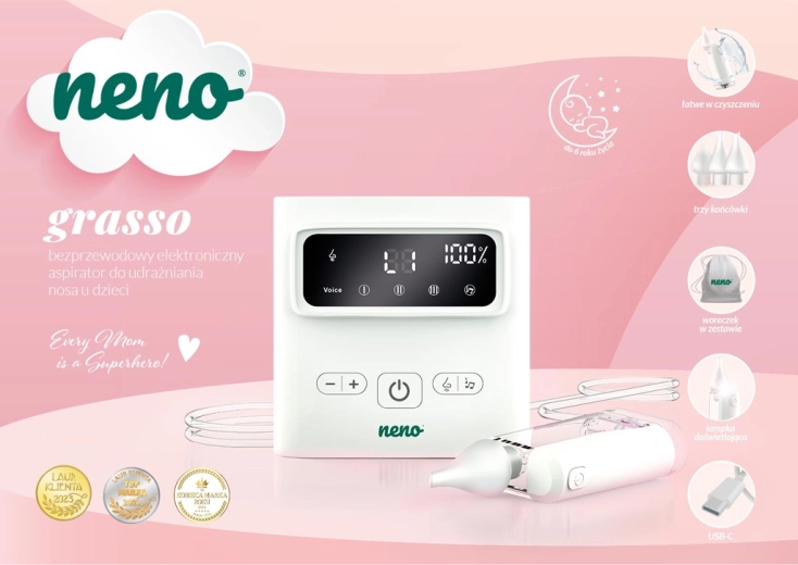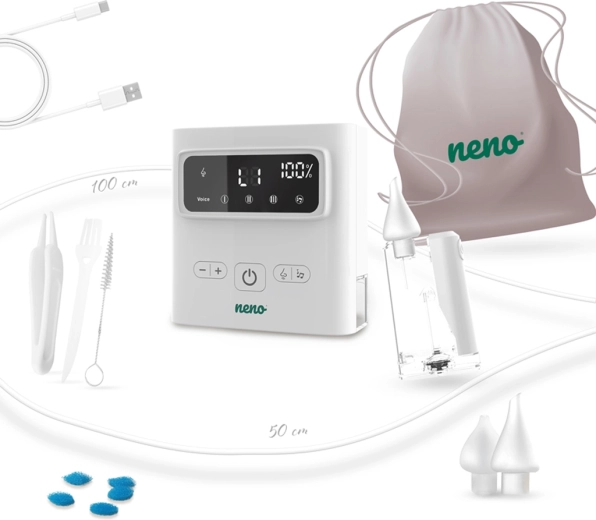 Datorită funcționării fără fir, încărcării USB‑C și dimensiunilor compacte, Neno Grasso este ideal și pentru călătorii. În cutie găsiți toate accesoriile necesare, inclusiv husa de protecție, furtunașe, filtre și ustensile de curățare – tot ce aveți nevoie pentru o utilizare sigură și confortabilă, de la naștere până la 6 ani.