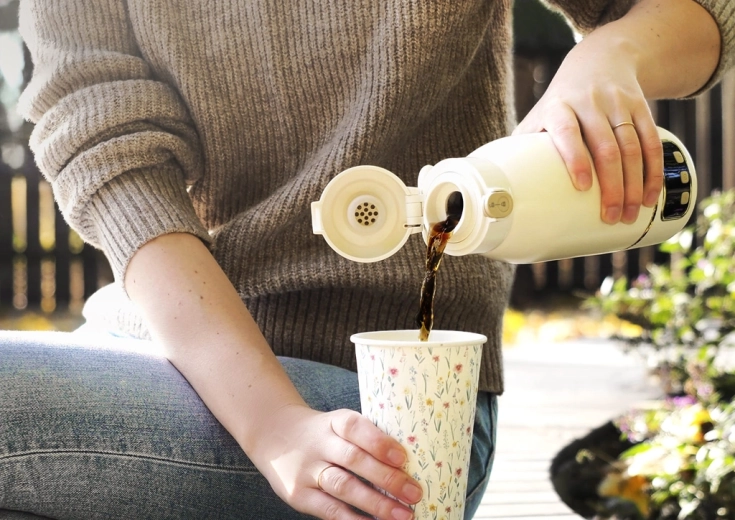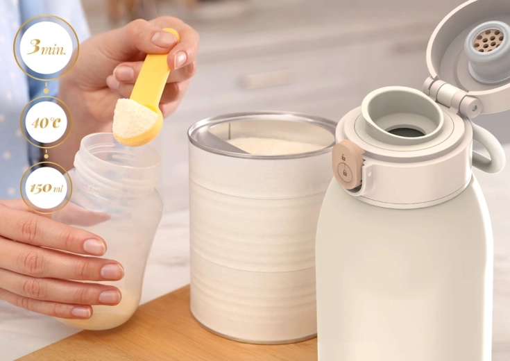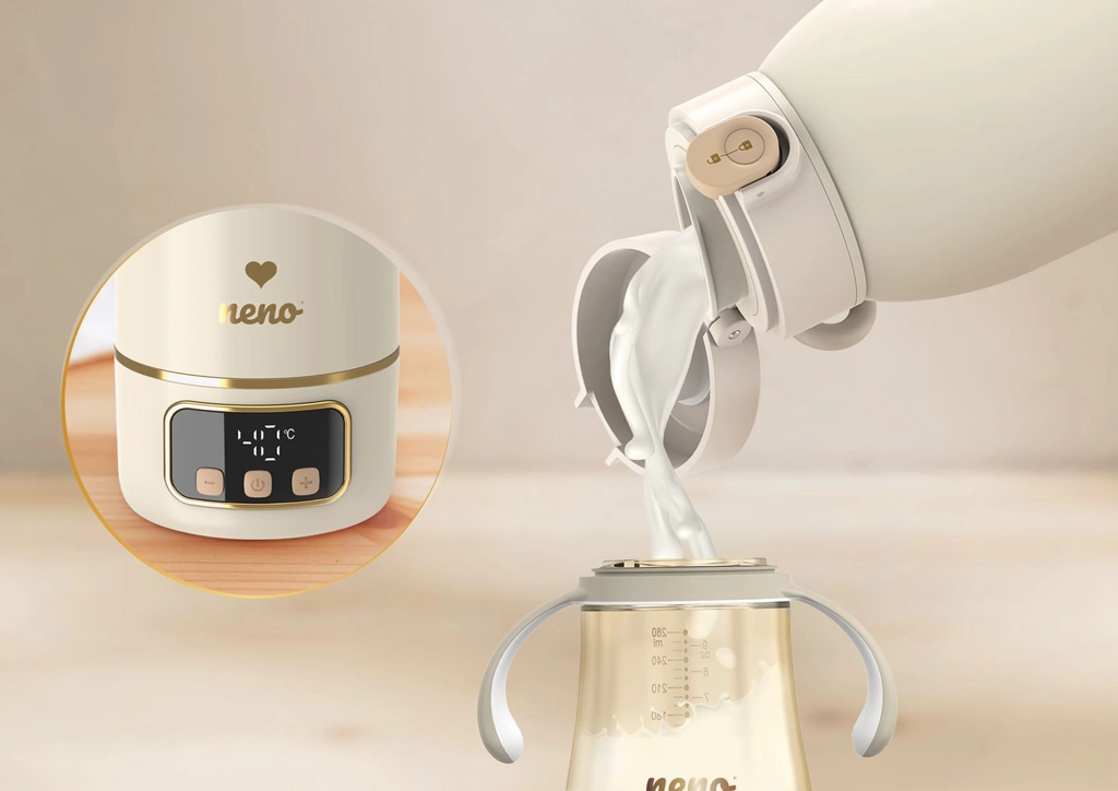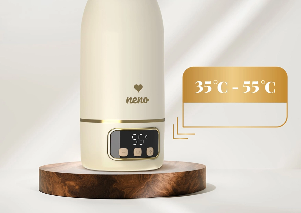 Controlul digital și intervalul de 35–55 °C permit setarea temperaturii ideale pentru laptele matern, apă și băuturile pentru părinți.