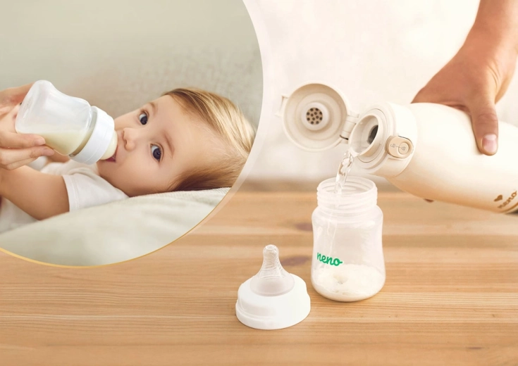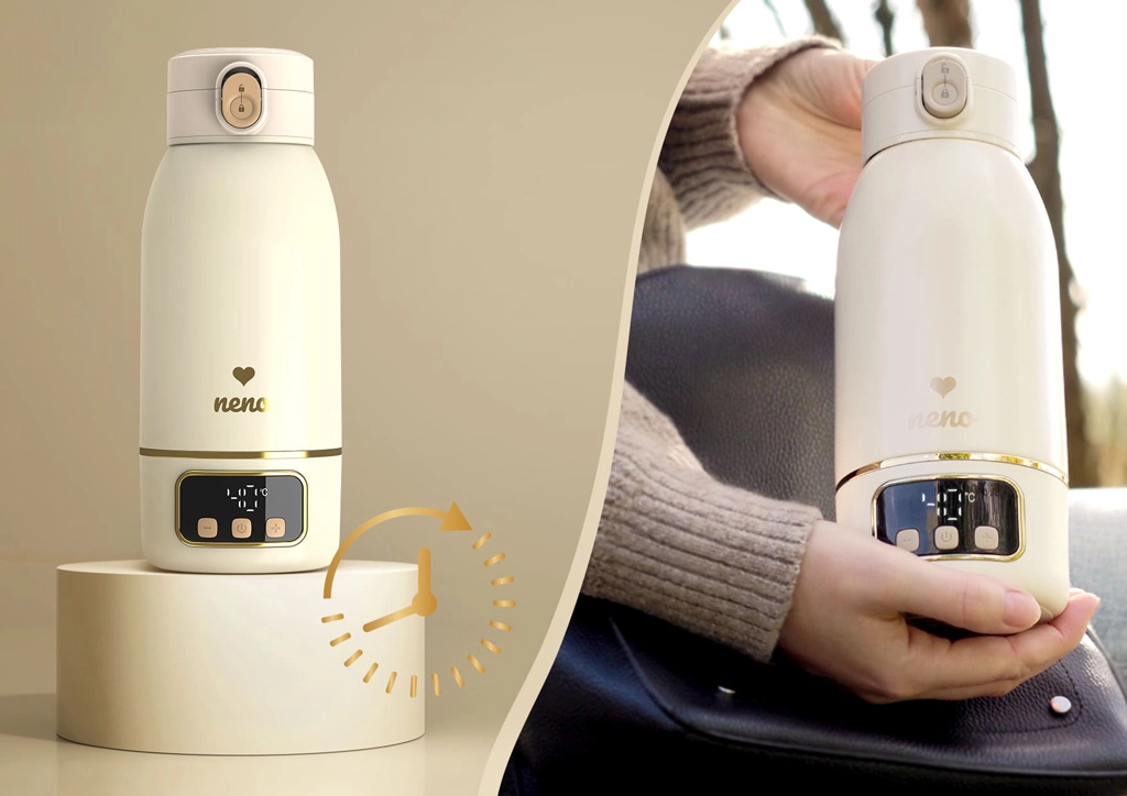 Neno Savia este un încălzitor modern, fără fir, care ușurează hrănirea oricând și oriunde. În doar 3 minute încălzește 150 ml de apă la aproximativ 40 °C și menține fiabil temperatura setată în intervalul 35–55 °C. Datorită construcției rezistente, capacului etanș și blocării împotriva pornirii accidentale, este potrivit pentru călătorii, pentru mașină și pentru plimbările zilnice.