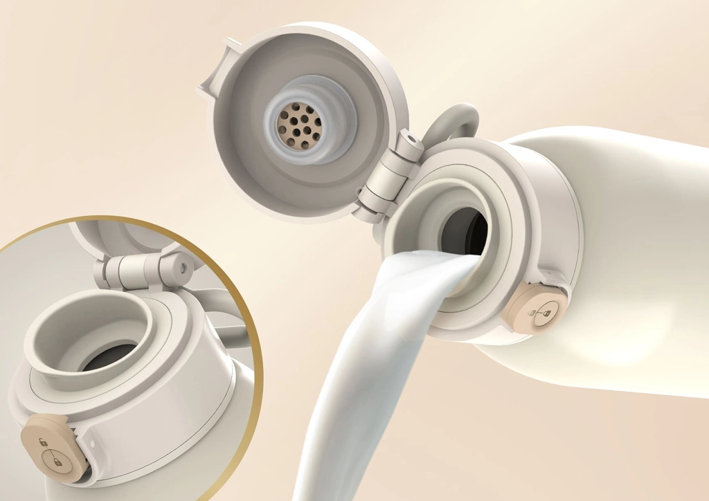 Capacul etanș cu blocare previne vărsarea în geantă, iar orificiul profilat asigură turnare curată și precisă, fără picături.