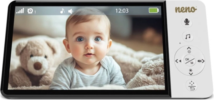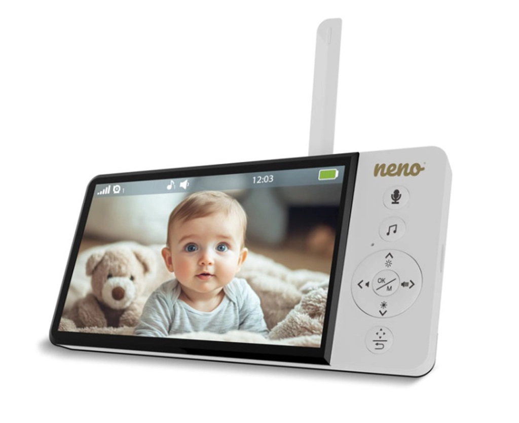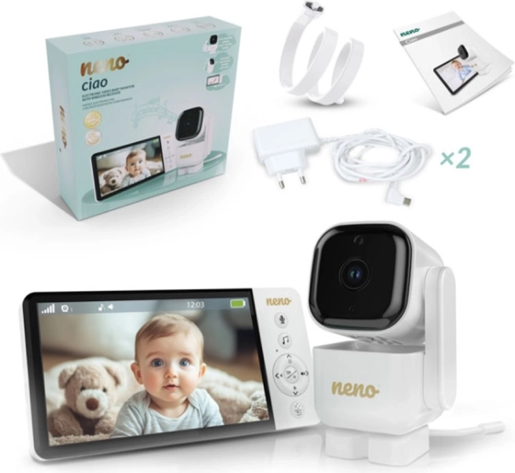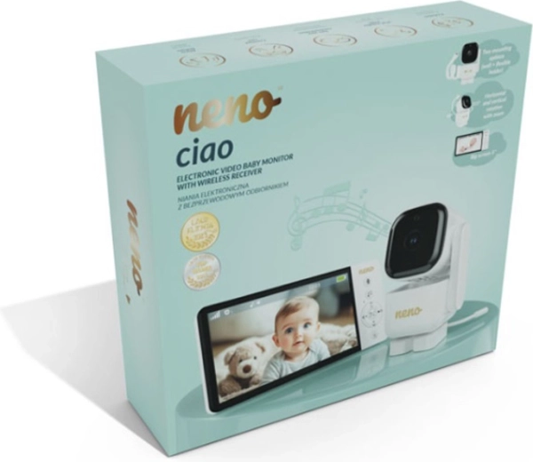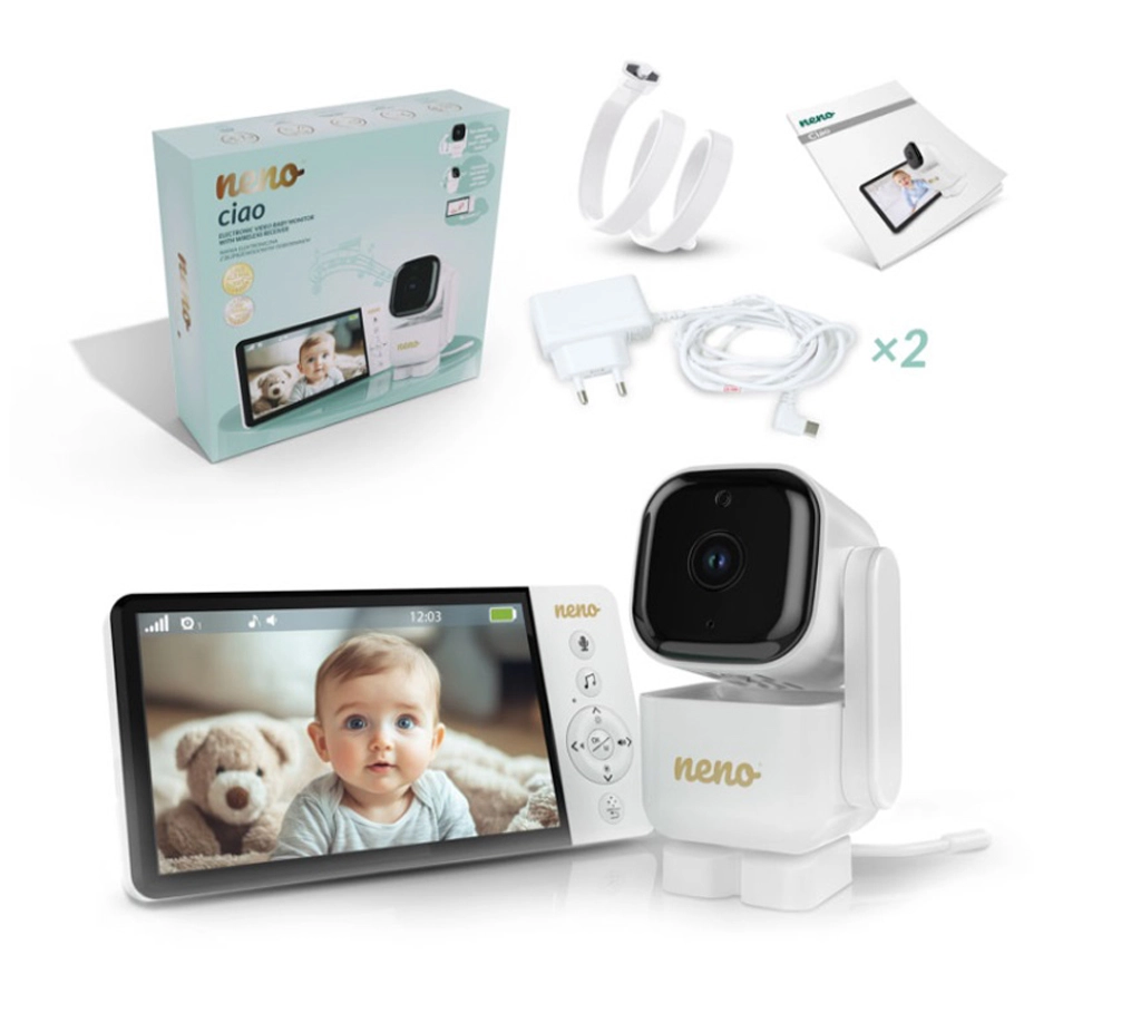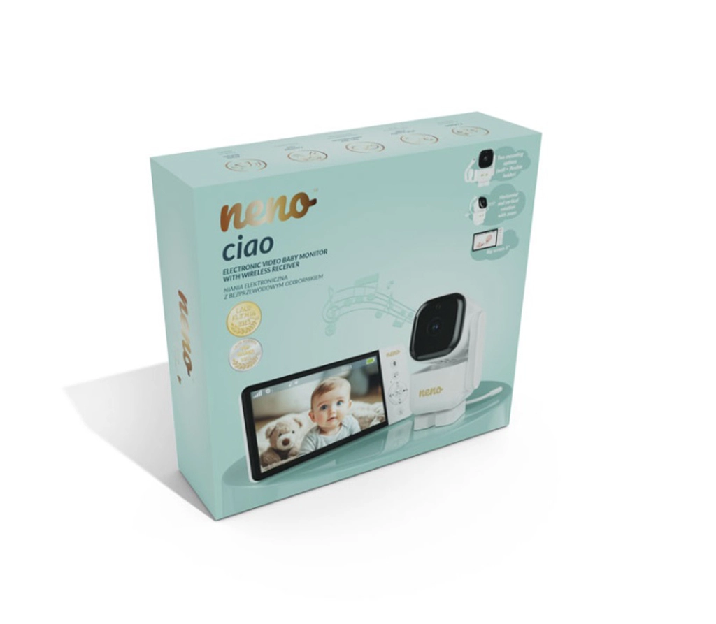 Videointerfonul inteligent Neno Ciao vă oferă liniște datorită ecranului color de 5", camerei rotative Pan & Tilt (355°/90°), viziunii pe timp de noapte, comunicației bidirecționale și tehnologiei VOX pentru economisirea energiei. Transmițătorul are rază de acțiune de până la 300 m, senzor de temperatură, 8 cântece de leagăn liniștitoare și autonomie a receptorului de până la 12 ore cu bateria integrată de 5000 mAh.