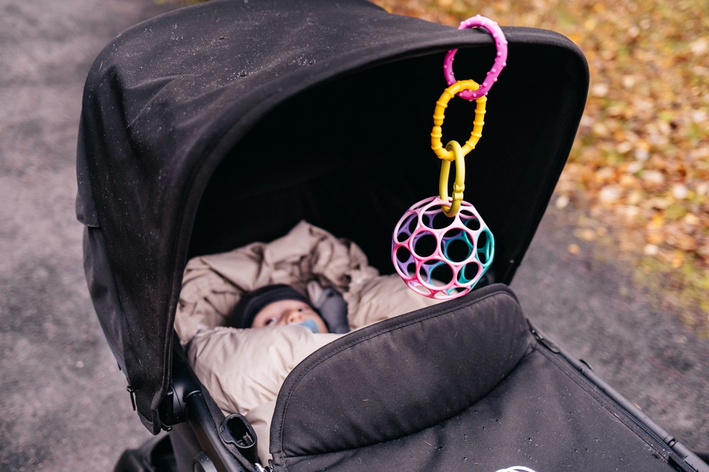 Datorită construcției rezistente și prinderii ușoare de inelele de siguranță, mingea este perfectă pentru cărucior sau scaunul auto.