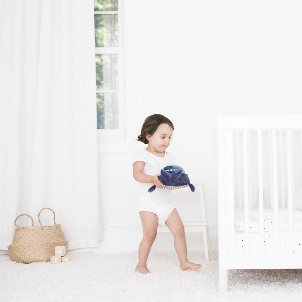 Alege un cântec de leagăn, o melodie marină sau zgomote albe (ploaie, valuri, bătăi de inimă). Volumul se ajustează ușor în funcție de mediul înconjurător și de starea bebelușului.