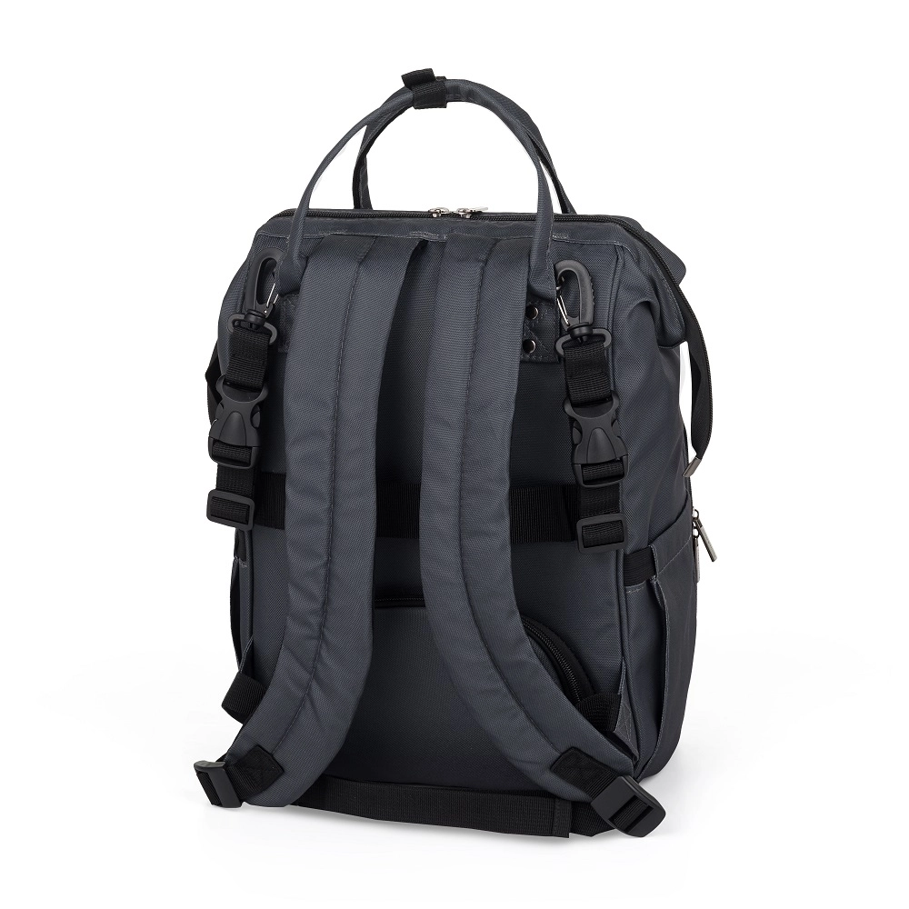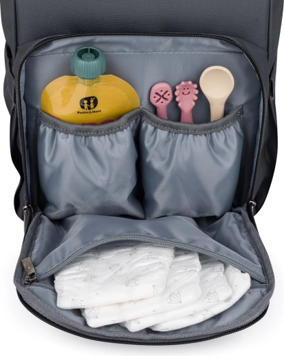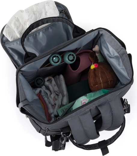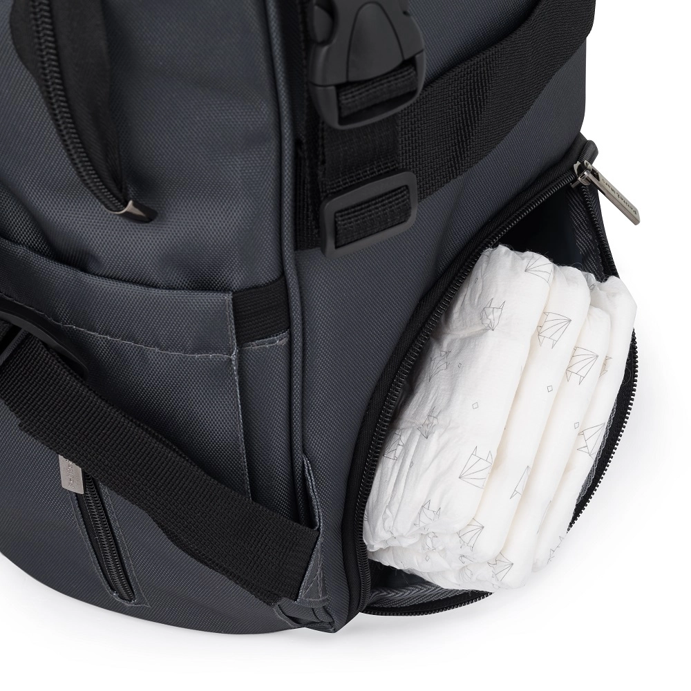Detaliile bine gândite fac din acest rucsac un partener de încredere: 11 buzunare, inclusiv 2 compartimente termo pentru biberoane, buzunare impermeabile pentru lucruri ude, buzunare din plasă pentru vizibilitate perfectă și buzunare exterioare pentru biberon și șervețele umede. Nu lipsesc șnurul pentru chei, suportul exterior pentru jucărie/breloc și cureaua pentru fixare pe mânerul trolerului. Căptușeala deschisă la culoare îmbunătățește vizibilitatea conținutului pentru căutări rapide și fără griji.