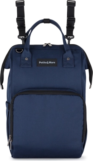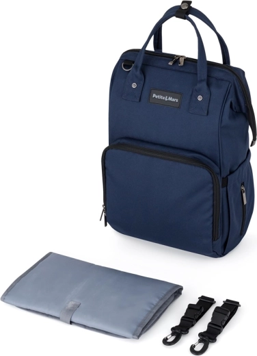 Rucsacul pentru cărucior Petite&Mars Jackob, stilat și funcțional, în culoarea albastru închis, oferă greutate redusă, organizare excelentă și materiale rezistente la umiditate. Datorită celor 11 buzunare, inclusiv buzunare termo, buzunar impermeabil pentru lucruri ude și acces lateral rapid, vei avea mereu totul la îndemână pentru bebeluș și părinți. Include salteluță de înfășat, se atașează ușor la cărucior și cântărește doar 800 g.