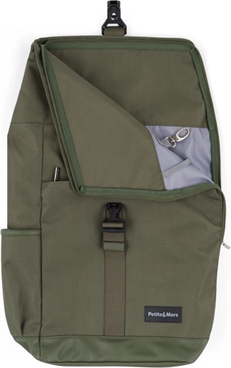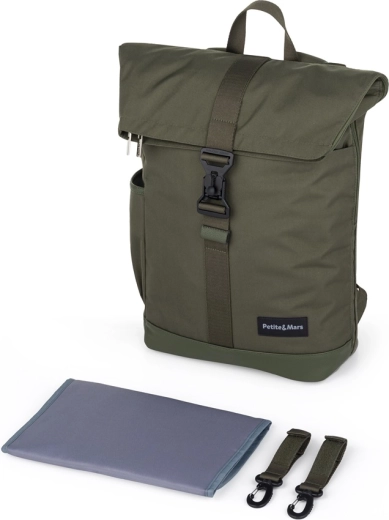 Rucsacul pentru schimbat scutece, organizat, elegant și de încredere PETITE&MARS JACKOB în nuanța Military Green oferă închidere tip roll-top cu cataramă magnetică FIDLOCK, deschidere laterală largă cu fermoar și organizare internă bine gândită, inclusiv buzunar termo, buzunar pentru laptop și săculeț impermeabil. Datorită curelelor pentru fixare pe cărucior, construcției ușoare și materialului rezistent, este ideal pentru plimbările zilnice și excursii.