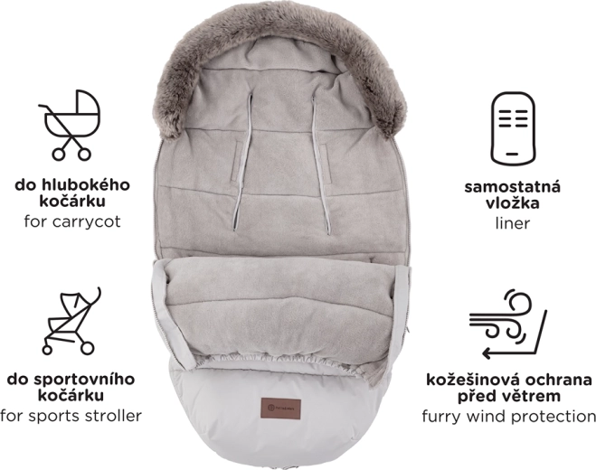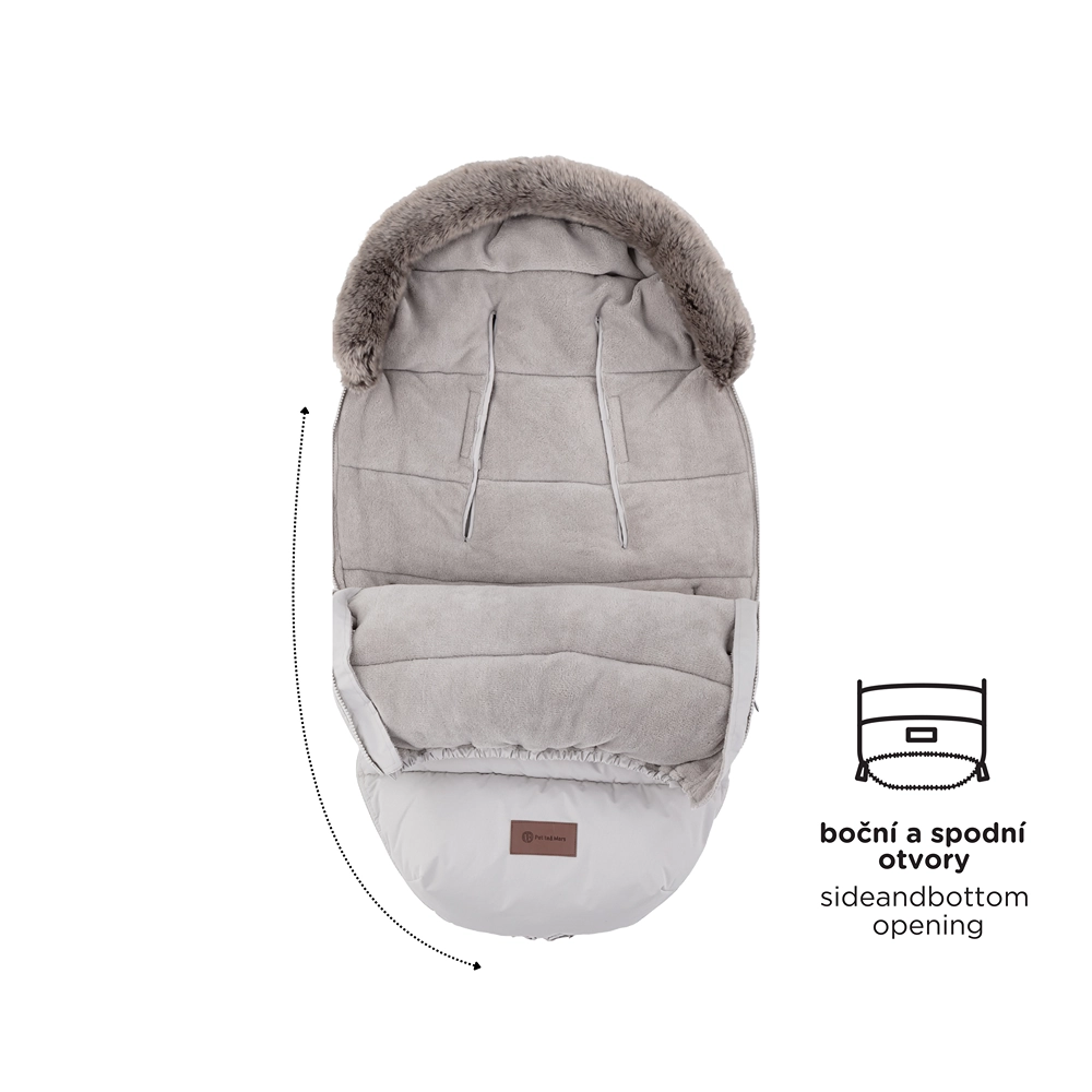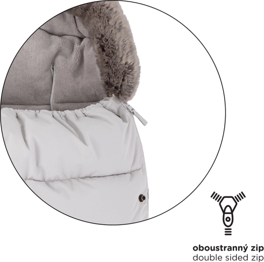 Fermoarele perimetrale permit desprinderea completă a părții superioare, aerisirea și crearea unei inserții separate din partea inferioară. În zona inferioară, fermoarele formează o practică deschidere pentru piciorușe. Buzunarul inteligent curbat, antiderapant de pe spate ajută la menținerea săculețului fix pe poziție, iar blănița detașabilă ușurează întreținerea.