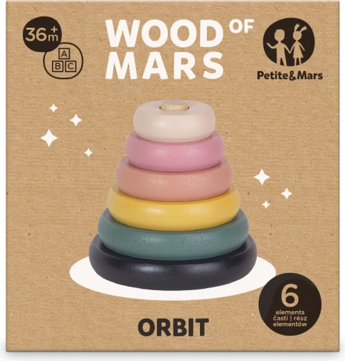 Piramida de stivuire din lemn Orbit din colecția WOOD OF MARS oferă copiilor o modalitate distractivă de a-și dezvolta abilitățile. Șase discuri colorate se așază pe o bază stabilă cu țăruș și susțin în mod natural concentrarea, răbdarea și înțelegerea mărimilor și a secvențelor.