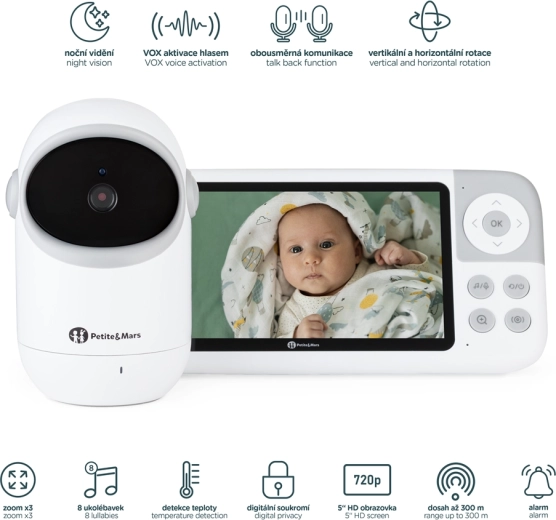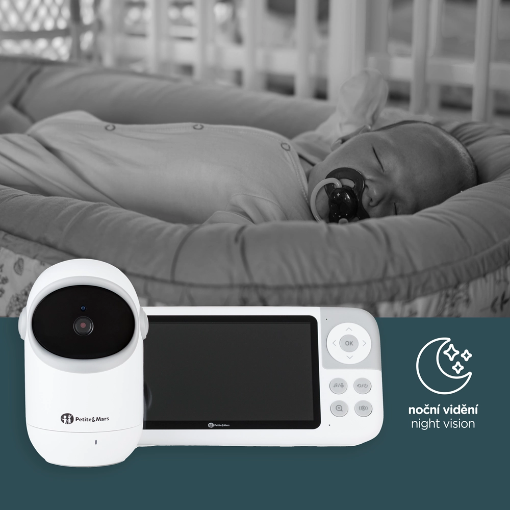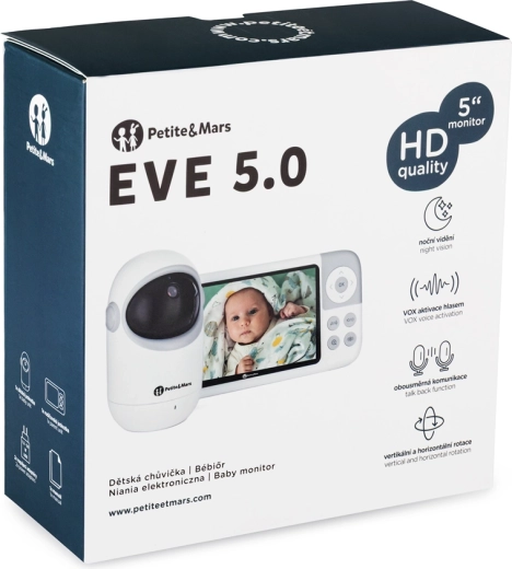Monitorul digital pentru bebeluși PETITE&MARS EVE 5.0 este conceput pentru supraveghere liniștită, fără aplicații și rețele complicate. Transmisia închisă, fără internet, îți protejează intimitatea, iar ecranul LCD de 5" cu imagine HD (720p) oferă detalii clare chiar și noaptea. Autonomia îndelungată a unității părinte și raza de acțiune de până la 300 m oferă libertate de mișcare în casă și în grădină.