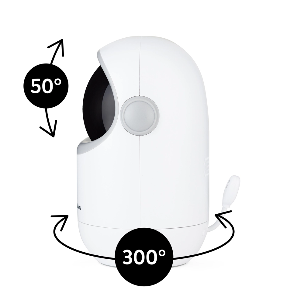 Camera permite rotire la distanță (orizontal până la 300°, vertical 30° în sus și 20° în jos) și un unghi de vizualizare de 68°, astfel încât nimic important nu îți scapă. Nu lipsesc modul VOX pentru economisirea bateriei, comunicarea în 2 sensuri, măsurarea temperaturii din încăpere și 8 cântece de leagăn liniștitoare. Sistemul poate fi extins până la 4 camere pentru supravegherea mai multor încăperi.