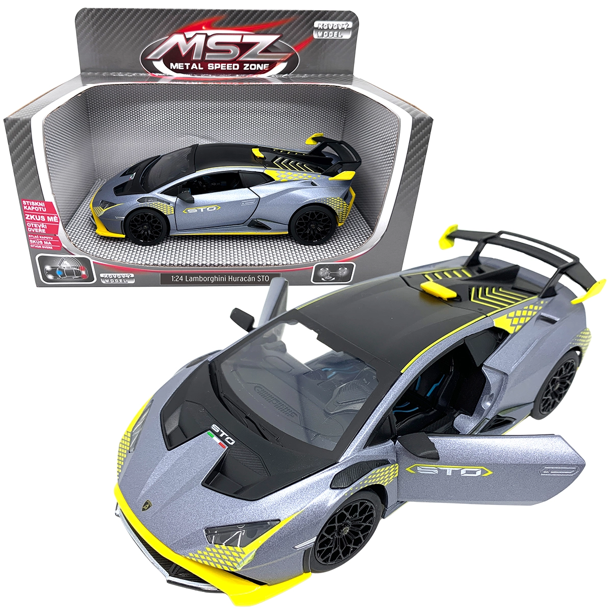 Descoperă modelul metalic realist LAMBORGHINI Huracán STO la scară 1:24, care îi va încânta atât pe copii, cât și pe colecționari. Oferă uși care se deschid, efecte luminoase și sonore și execuție precisă din metal cu detalii din plastic, pentru durabilitate îndelungată și o experiență grozavă de joacă.