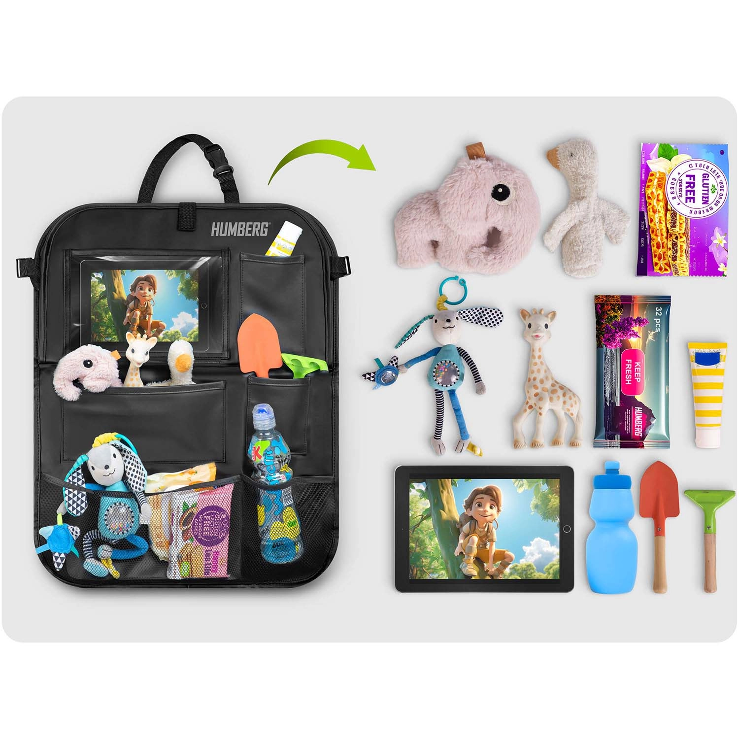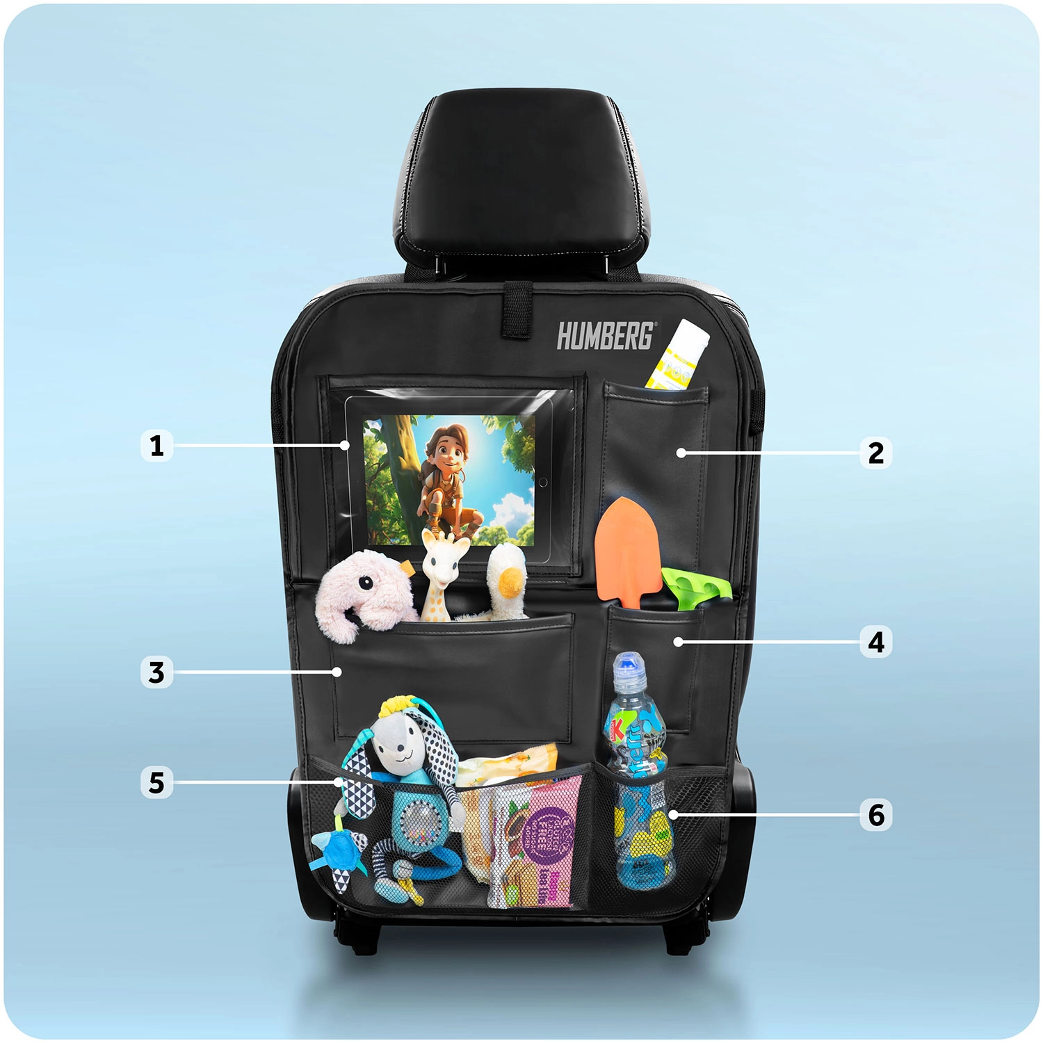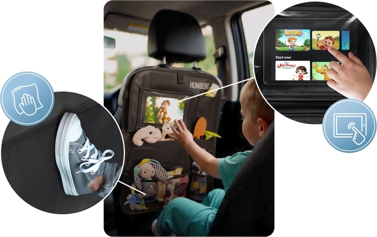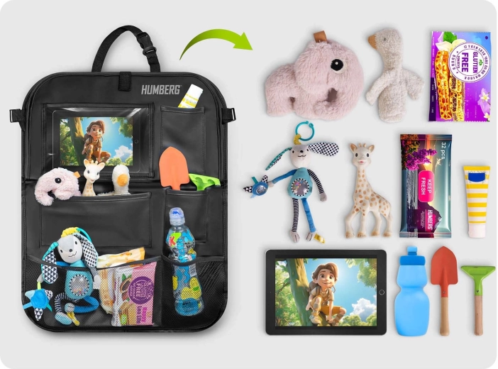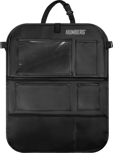 Transformați haosul de pe bancheta din spate în ordine. Organizatorul HUMBERG oferă o compartimentare inteligentă a spațiului de depozitare: buzunar mare transparent pentru tabletă (până la 11,9"), măsuță rabatabilă pentru scris și gustări, suporturi pentru băuturi elastice și mai multe buzunare pentru jucării, cărți și șervețele. Suprafața rezistentă din PU, imitație de piele, se curăță ușor și în același timp protejează spătarul împotriva petelor și loviturilor.