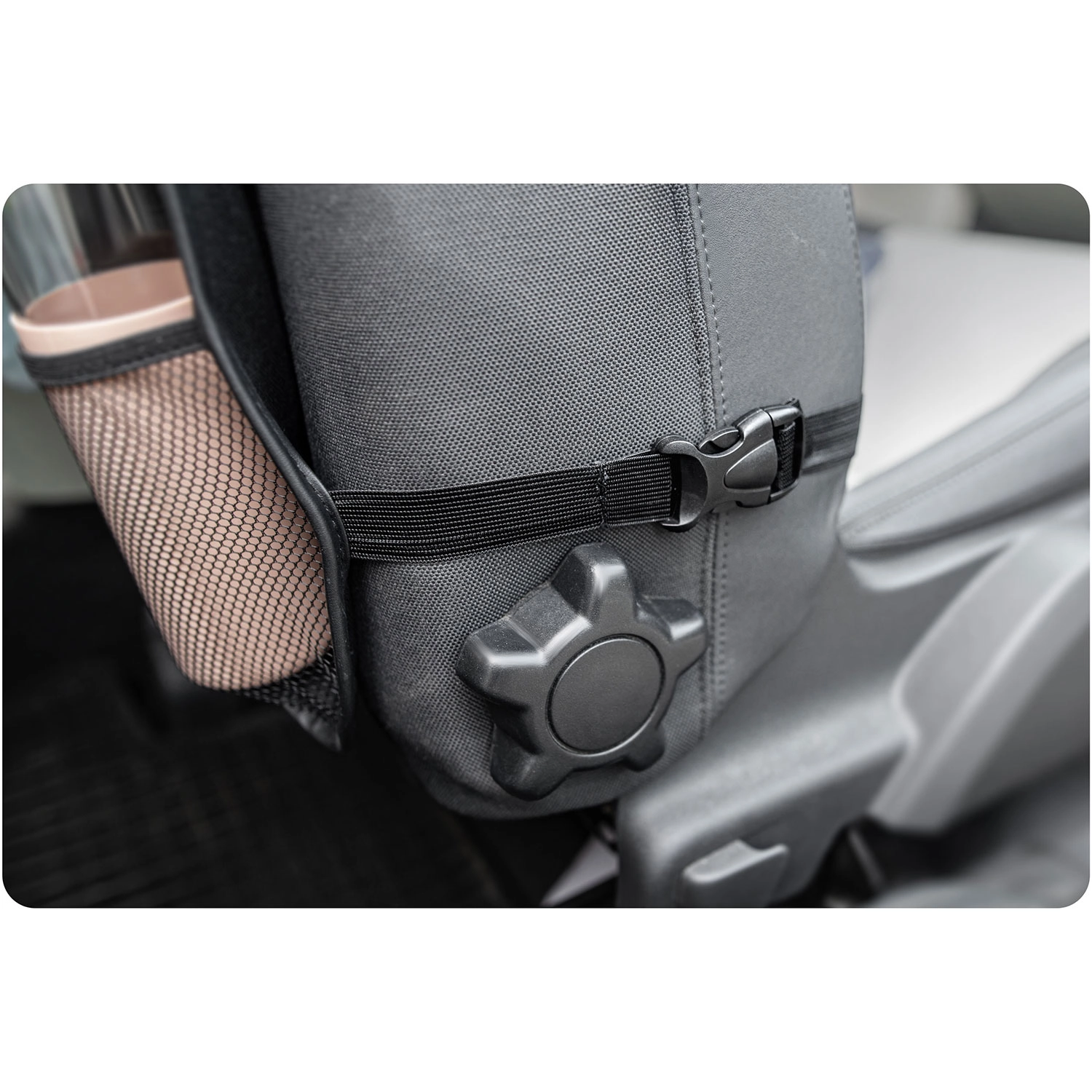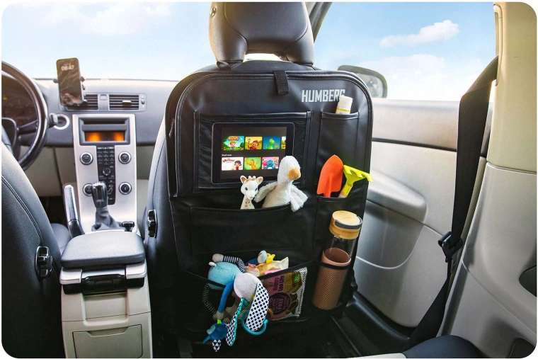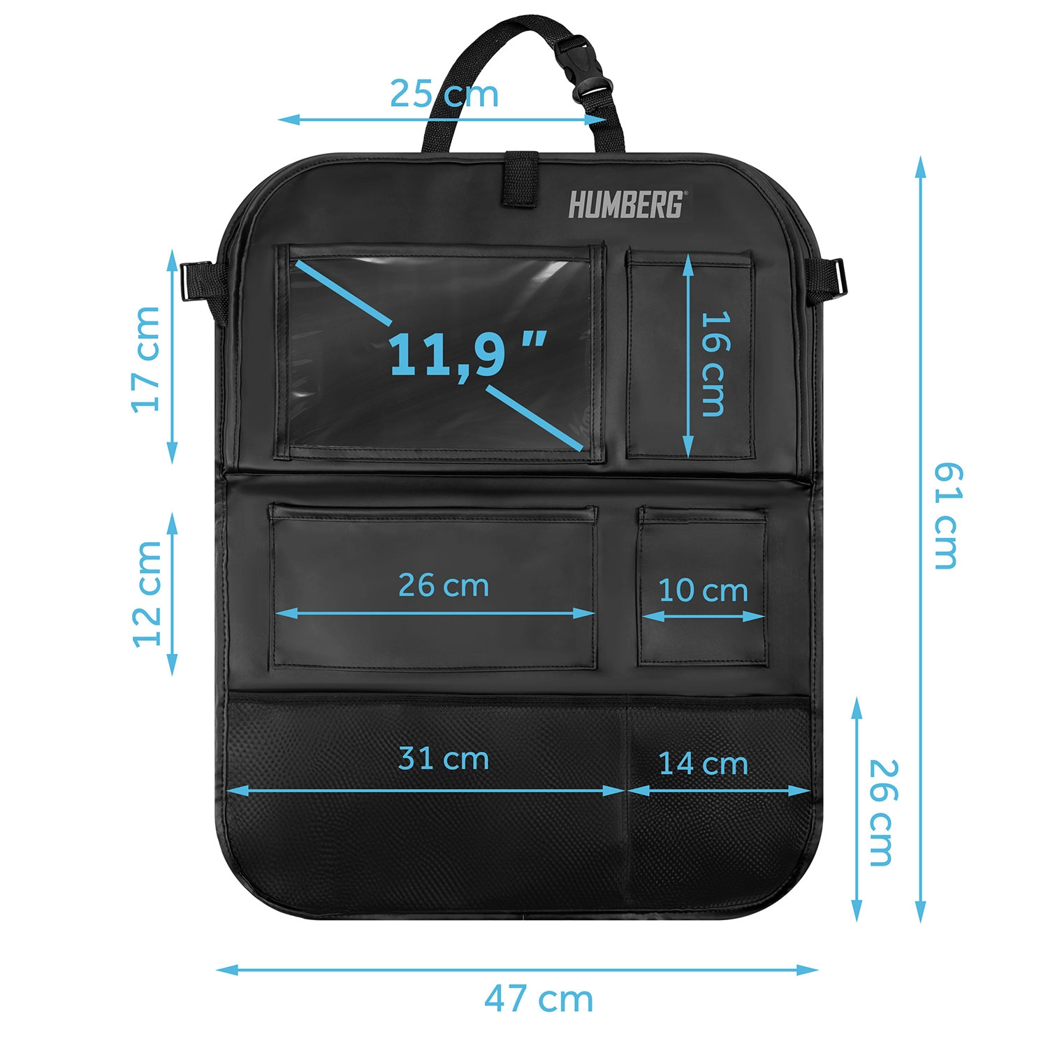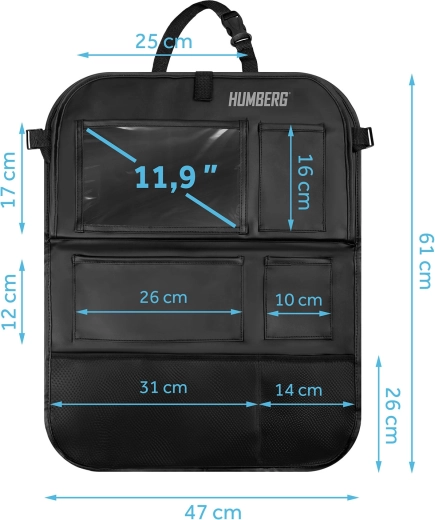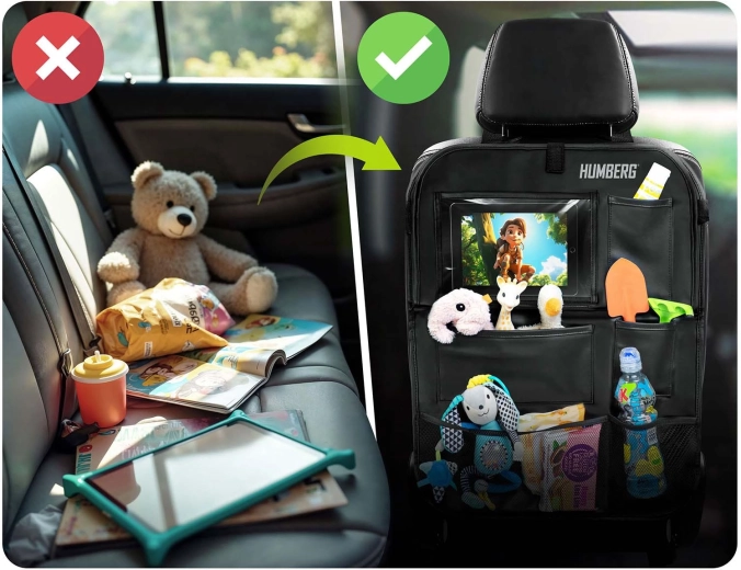 Transformați haosul de pe bancheta din spate în ordine. Organizatorul HUMBERG oferă o compartimentare inteligentă a spațiului de depozitare: buzunar mare transparent pentru tabletă (până la 11,9"), măsuță rabatabilă pentru scris și gustări, suporturi pentru băuturi elastice și mai multe buzunare pentru jucării, cărți și șervețele. Suprafața rezistentă din PU, imitație de piele, se curăță ușor și în același timp protejează spătarul împotriva petelor și loviturilor.