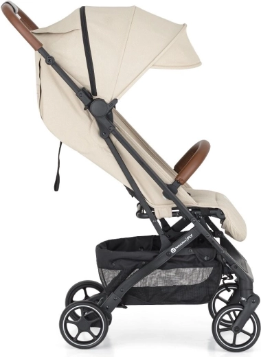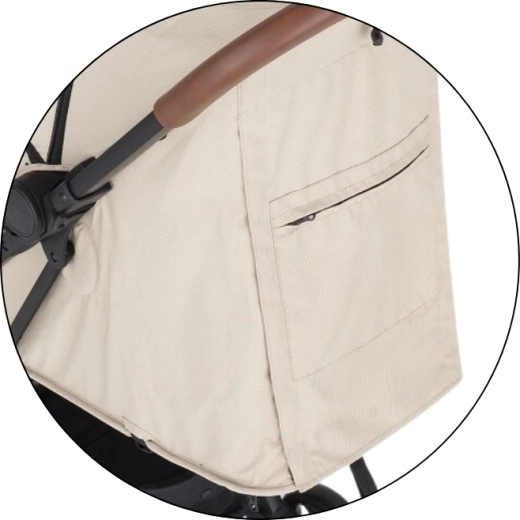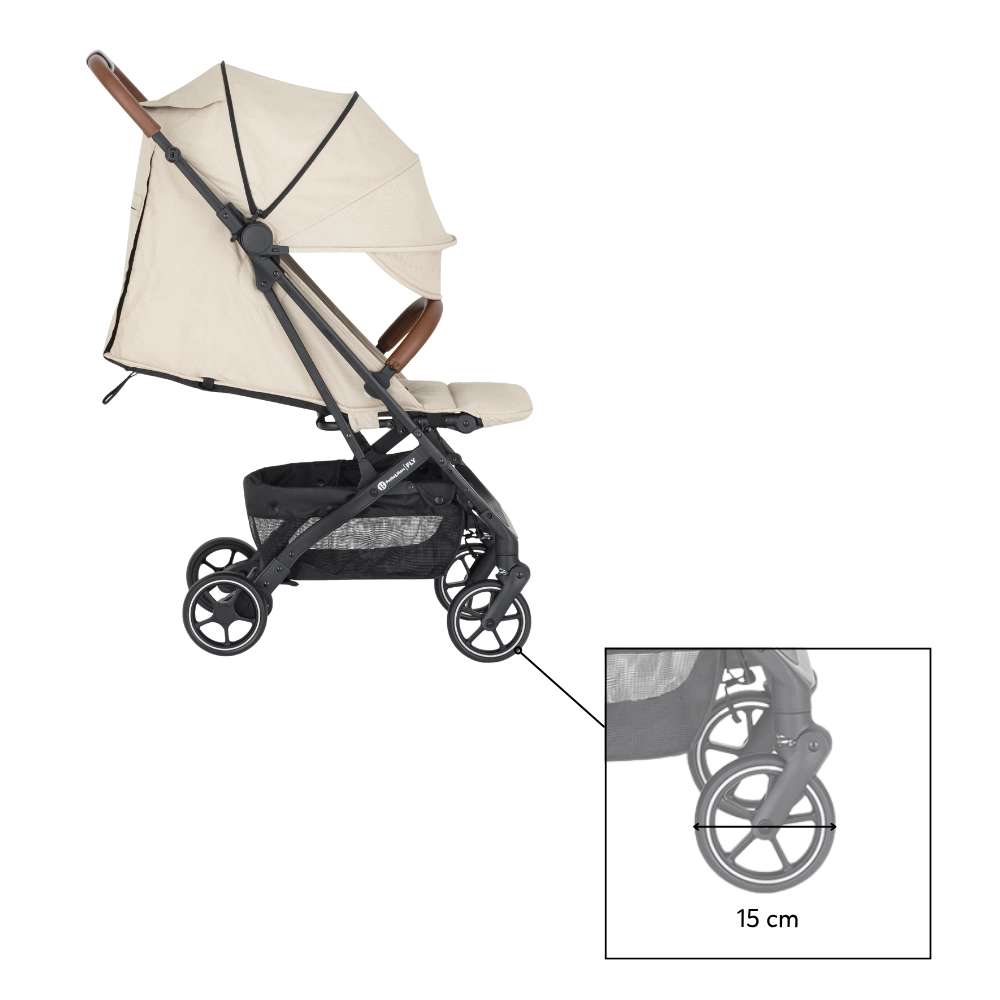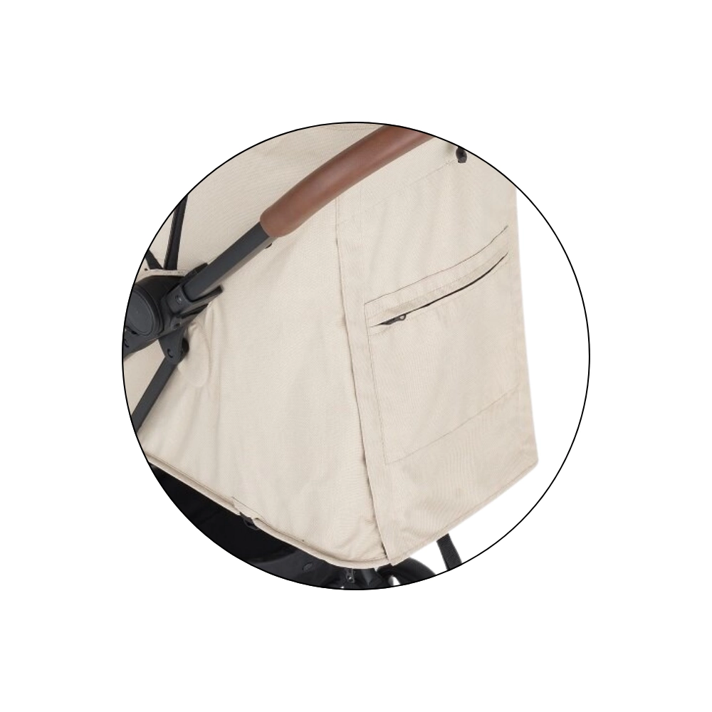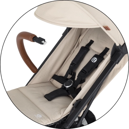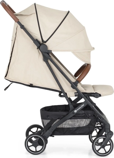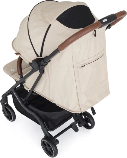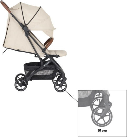 Capotina extensibilă cu cozoroc protejează eficient de soare și vânt. Pe timp cald veți aprecia fereastra din plasă din capotină și marea plasă de ventilație din spate după rularea husei. Părinții vor aprecia bara frontală detașabilă pentru acces rapid la copil, mânerele din piele ecologică pentru o priză plăcută, buzunarul posterior practic pentru mărunțișuri și coșul de cumpărături încăpător. Este inclus și un suport pentru băuturi.