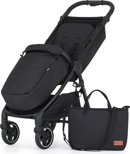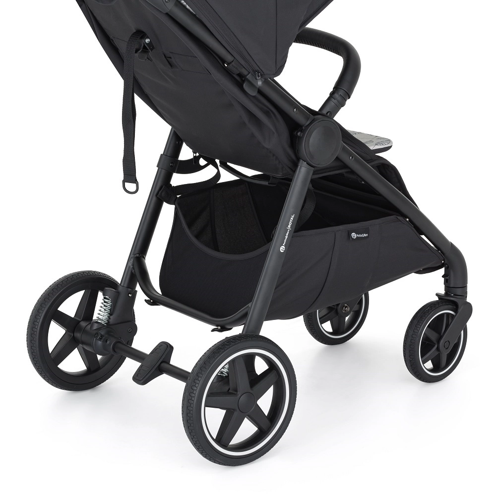Roțile din cauciuc integral cu bordură albă stilată și suspensie asigură o deplasare stabilă chiar și pe denivelări și nu pot fi afectate de pene. Structura din aluminiu, frâna centrală și prinderea de calitate a roților garantează siguranța, în timp ce coșul de cumpărături mare și geanta pentru schimbat ușurează ieșirile zilnice. Căruciorul crește odată cu familia – copertina poate fi înlocuită ușor cu altă culoare (compatibilă cu Royal2/Royal3).