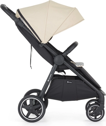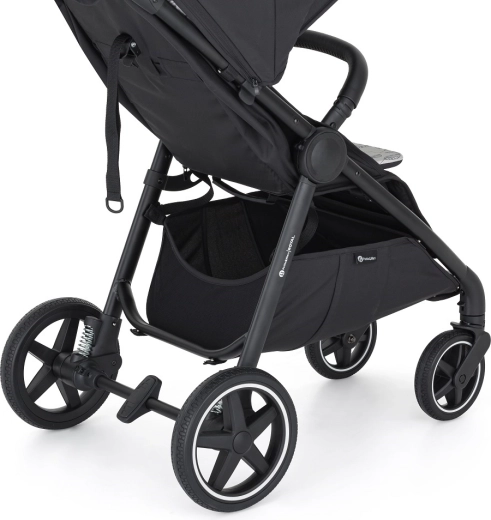 Roțile mari din spate și roțile din față pivotante cu blocare oferă o rulare lină pe trotuarele urbane și pe teren ușor – fără risc de pană.
