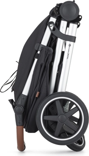 Mâner și bară de protecție din piele eco maro, coș mare, husă pentru picioare și geantă pentru înfășat incluse în pachet. Plierea cu o singură mână spre interior menține husele curate.