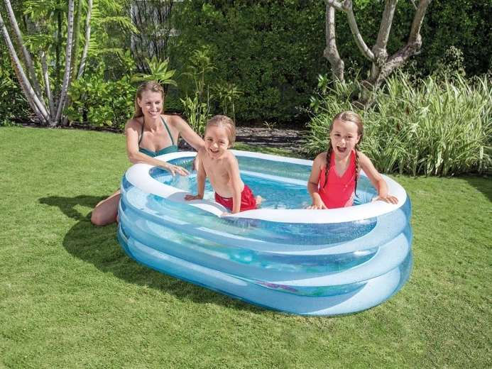 Această piscină ovală pentru copii INTEX aduce joaca acvatică sigură și distractivă la tine acasă. Trei camere gonflabile transparente creează pereți stabili și moi, confortabili, în timp ce fundul colorat cu motive vesele stimulează imaginația copiilor. Datorită dimensiunilor compacte de 163 × 107 × 46 cm și greutății reduse, se transportă și se depozitează ușor.