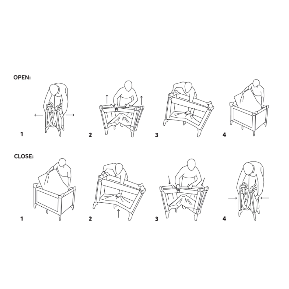 Pătuțul respectă standardul EN 716 și este proiectat cu accent pe siguranță – Double Lock previne plierea accidentală în timpul utilizării. Sunt incluse suprafața de odihnă pliabilă și geanta de transport. Pentru nou-născuți se poate achiziționa un nivel suplimentar pentru îngrijire mai confortabilă și ergonomică.