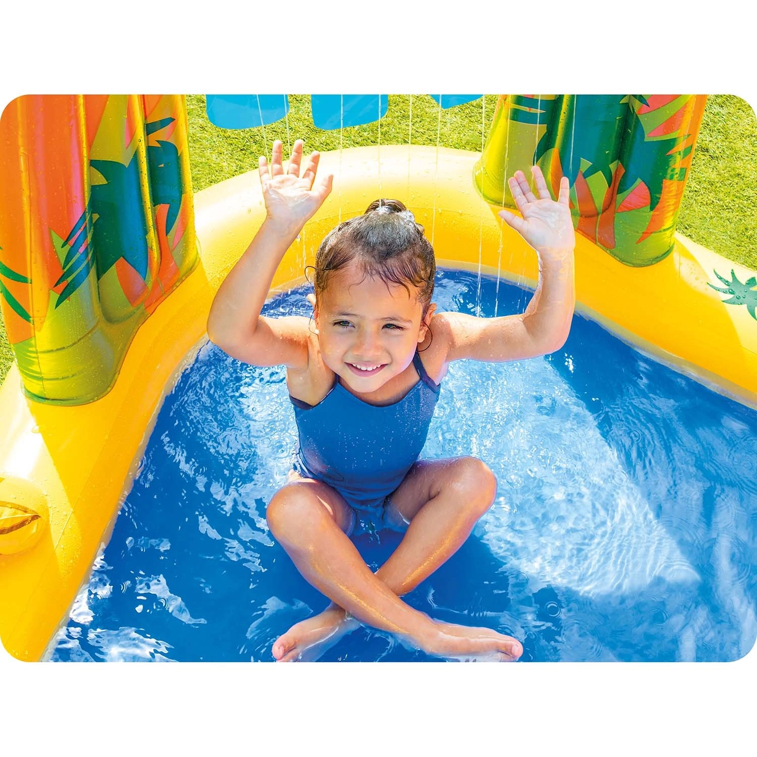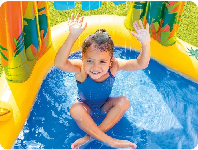 Dispozitivul de pulverizare integrat creează o ploaie plăcută de apă din palmier/frunză. Doar conectați furtunul de grădină și copiii se vor bucura de un duș răcoritor în timpul alunecărilor și jocurilor în bazin.