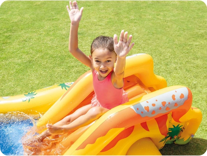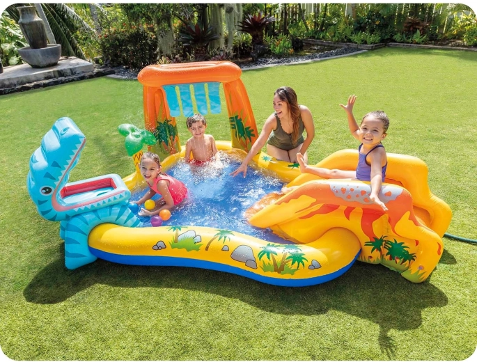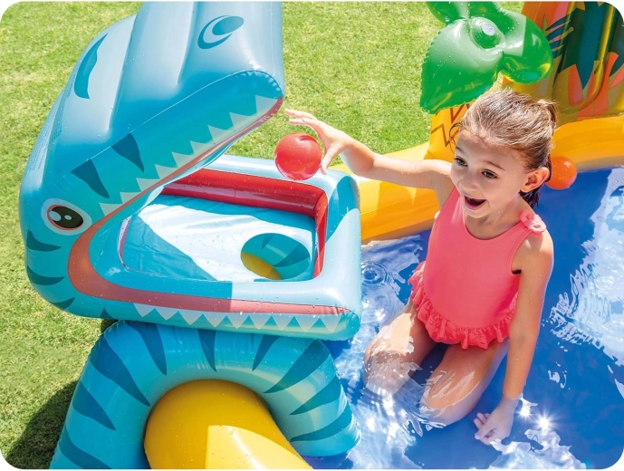 Locul de joacă acvatic pentru copii cu tematică de dinozauri aduce numeroase posibilități de joacă: un bazin puțin adânc pentru bălăceală sigură, un tobogan gonflabil cu sosire moale și un duș de apă din palmier sau frunză, care răcorește în arșița verii. Marele dinozaur gonflabil invită la joc cu mingi – „hrăniți-l” și antrenați precizia.