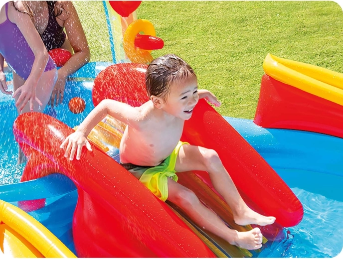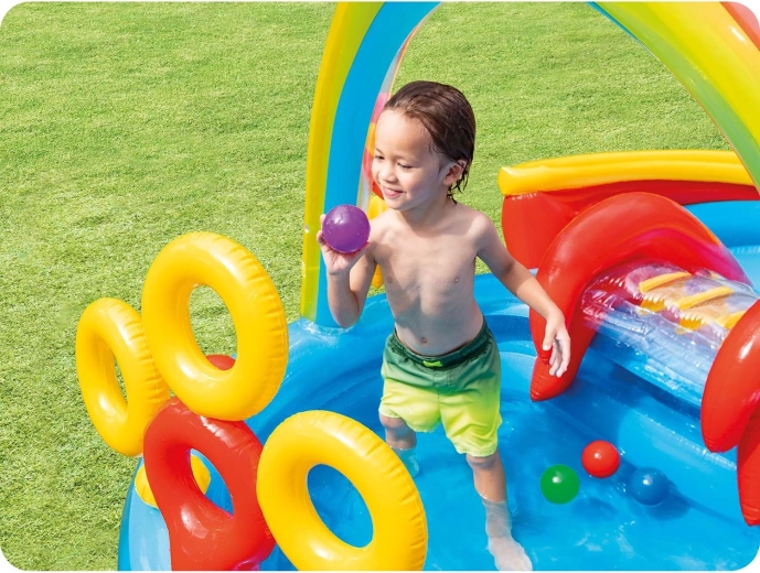 Centrul acvatic gonflabil Intex Curcubeu este alegerea ideală pentru zilele fierbinți de vară. Copiii se vor bucura de alunecarea în piscina mică, răcorirea sub dușul de apă din arcul curcubeu și de numeroase jocuri cu inele și mingi colorate. Datorită celor două piscine separate, joaca este sigură, clar organizată și ușor de adaptat vârstei copiilor.