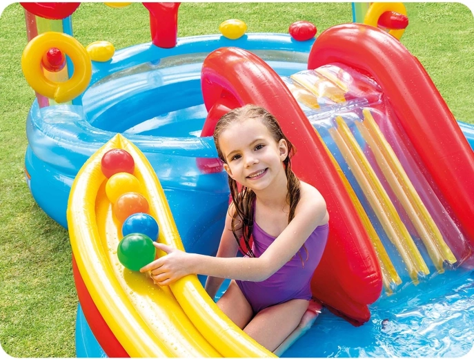 - Distracție multifuncțională: tobogan, arc de duș, ringo cu 4 inele și rampă pentru bile cu 6 mingi.
