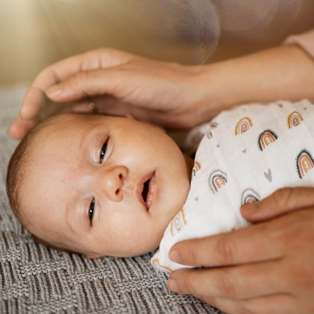 Formatul 120 × 120 cm facilitează o înfășare sigură și confortabilă și multiple utilizări – de la păturică la paravan pentru cărucior sau pătură subțire pentru scaunul auto.