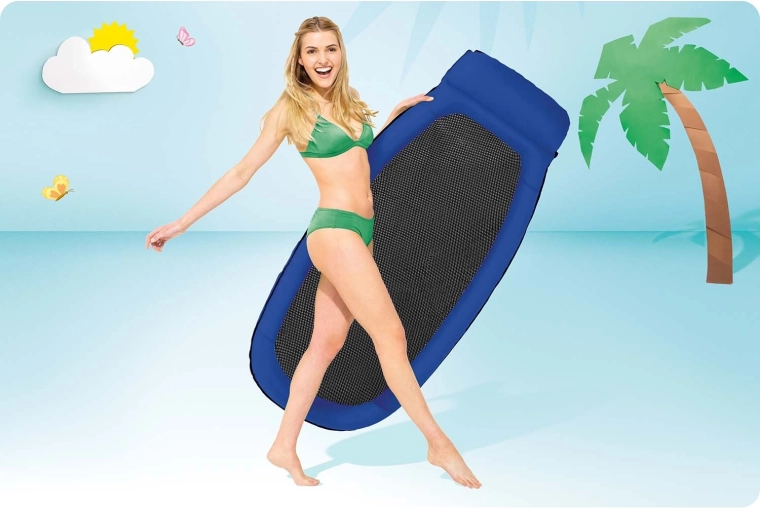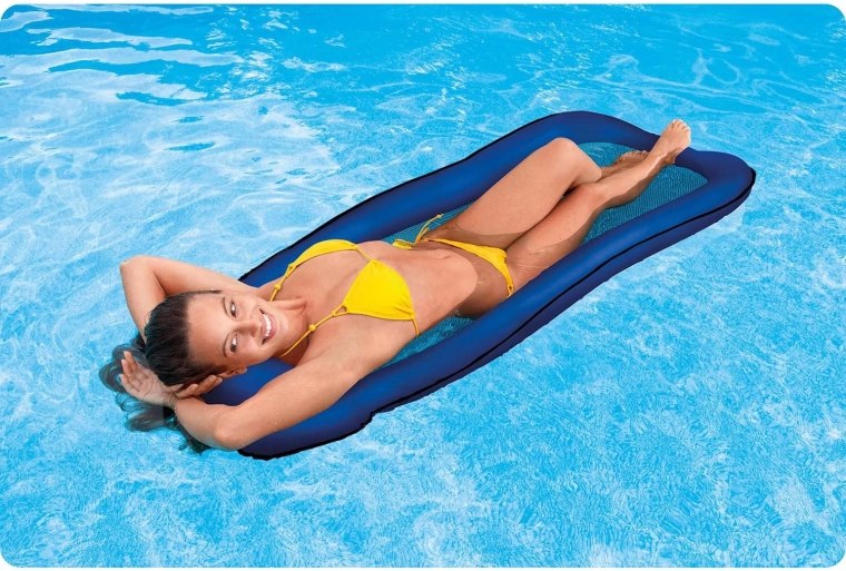 Salteaua de plajă Intex se remarcă printr-o construcție unică, cu fund din plasă, care permite răcorirea constantă fără a fi nevoie să intri complet în apă. Este fabricată din PVC durabil în combinație cu plasă și, datorită pernei integrate, oferă o poziție confortabilă pentru relaxare.